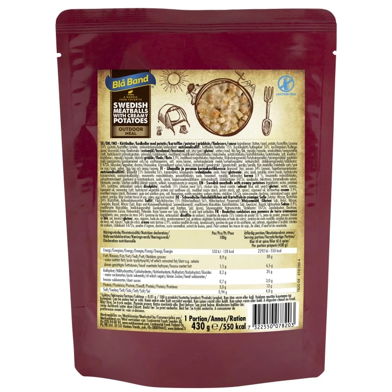 Blå Band Schwedische Frikadellen mit cremigen Kartoffeln ist eine schnelle und gute Art, dem Körper Nährstoffe zuzuführen.Zutaten: Wasser, Kartoffeln 34%, Frikadellen 15% (Hähnchenfleisch 56%, Hähnchenhaut, Semmelbrösel (Weizenmehl, Salz, Hefe), Wasser, Zwiebeln, Rapsöl, Würze (Salz, hydrolisiertes Pflanzeneiweiß und Sonnenblumenöl), modifizierte Maisstärke, Kartoffelstärke, Salz, Gewürze), Rapsöl, laktosefreie Sahne 3,9%, modifizierte Maisstärke, Verdickungsmittel: Guarkernmehl und Xanthan, jodiertes Speisesalz, Aromastoffe (enthält Weizen, Gerste und Sellerie), Säureregulator: Natriumcitrate, Stabilisator: E472e, Zwiebelpulver, Dextrose, karamellisierter Zucker, Hefeextrakt, Petersilie. Kann Spuren von Soja, Ei und Senf enthalten.Kategorie:NassmehlInhalt: 430 g.Haltbarkeit: 36 Monate bei Umgebungstemperatur in gemäßigtem Klima oder gemäß NATO-Standard AMedP-1.11; Kapitel 3 – Shelf Life.Lagerung: Trocken bei Raumtemperatur.Nährwerte pro 100g: • Energie KJ 533/ kcal 128 • Fett 8,9g • Kohlenhydrate 8,2g • Ballaststoffe 0,7g • Eiweiß 3g • Salz 0,94g