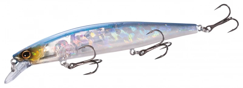 Bei konstantem Einholen hat er eine enge, aber aggressive Wobble-Aktion, wenn er gestoppt wird, schwebt er mit perfekter Balance und wenn er gezuckt und geruckt wird, erwacht er mit einer breiten, aggressiven, gleitartigen Aktion zum Leben. Fitted with Shimano’s AR-C / JET BOOST moving weight technology which stabilizes the flight, improves distance and delivers pinpoint accuracy, the World Minnow also contains FLASH BOOST technology to create additional visual attraction when moving and also when stationary. For increased visual attraction, the use of Kyorin / SCALE BOOST 3D holographic film gives a remarkable life-like scale pattern which is especially noticeable as the lure is stopped during the retrieve.Tight swimming action when retrieved at a constant speed plus a wide kicking action when twitched and jerked.Centre balanced for correct positioning when paused.Suspending – diving depth 1.5m.FLASH BOOST technology allows the lure to constantly emit anattractive flash, even when stationary.AR-C / JET BOOST system for increased casting distance.Kyorin / SCALE BOOST, 3D holographic film for remarkable life-like scale reality.A versatile performer which can be used with a wide range of retrieve techniques. At a constant speed the lure aggressively wobbles with a tight pattern but when stopped and jerked it has a very wide, aggressive action.